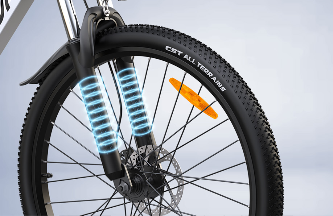 Our e-bike features a premium lockable suspension fork that delivers smooth shock absorption on rough terrain. The adjustable system reduces bumpy vibrations while maintaining efficiency on paved roads when locked.